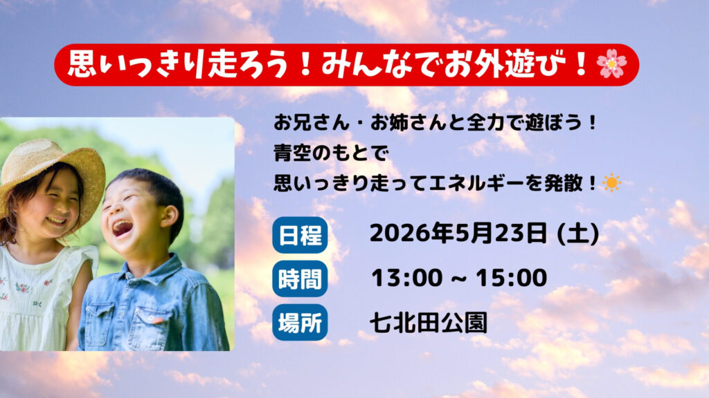 5月は、気持ちの良い季節を活かして、広大な七北田公園で「みんなでお外遊び!」を開催します!