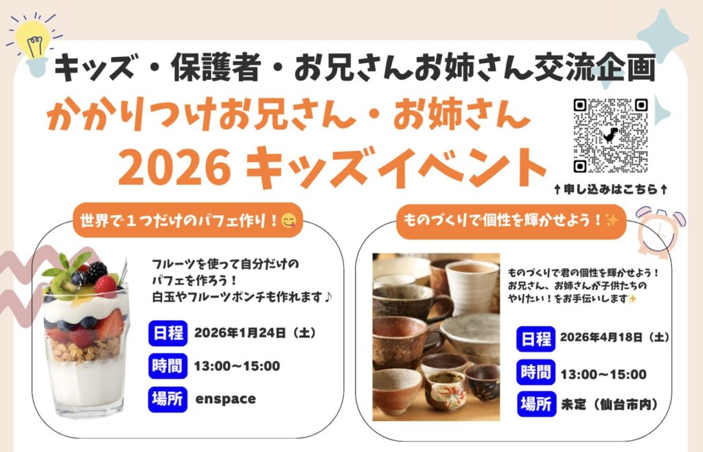 寄付する 『かかりつけお兄さん・お姉さん キッズイベント2025』のお知らせ 普段は1対1での関係性を大切にしている私たちですが、子ども達、保護者達、そしてスタッフ同士が楽しく繋がろう!という目的で、月イチでイベント開催をすることにしました! 開催概要(予定) 9/20(土)13:00–15:00|七北田公園にて 「スポーツ&生き物探し」 10/13(月・祝)13:00–15:00|水の森公園にて「キャンプ場で焼き芋体験!」 11/3(月・祝)13:00–15:00|Sports Labo@XEBIO ARENA(長町駅近く)にて、「室内遊び大会」 12/6(土)13:00–15:00|enspace 1階(広瀬通駅近く) にて「メリークリスマス!みんなでパーティー」※2025年12月5日時点の個別支援利用者のご家庭限定対象は、病気や障がいがある子どものきょうだいとそのご家族です。当法人のきょうだい支援「かかりつけお兄さん・お姉さん」を利用していない方も、どなたでもお申込みいただけます(※12月イベントは除く)。 当日は、元気いっぱいのお兄さん・お姉さんがお子さんと全力で遊びます。その間、保護者の皆さまには親同士の交流の時間を楽しんでいただければ幸いです。詳細はチラシや申込フォームに記載されております。「この場合も参加できますか?」といったご質問も大歓迎です。ぜひご友人様もお誘い合わせのうえ、下記申込フォームから申込後、お気軽にご参加ください。当日、皆さんとお会いできる日を楽しみにしております!!! ▼申込フォームhttps://docs.google.com/forms/u/0/d/e/1FAIpQLSel_1ZWdjYClFjXr4mOrA9fWETJkL7laquxIXzW82Rr_44_cw/viewform?pli=1 プライバシーポリシー Copyright 2023-2025 一般社団法人ari